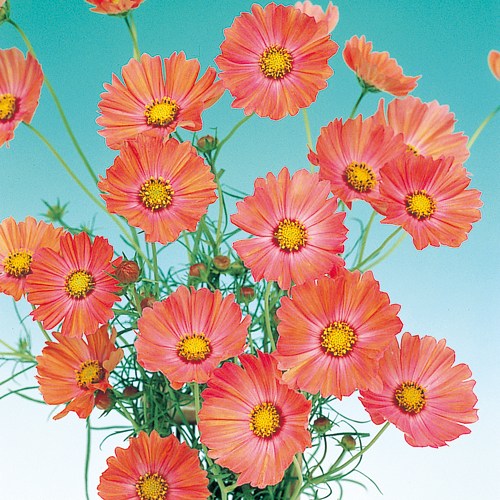 珍しい淡橙色の秋咲き。花径6~7cmの中輪花。茎は緑色。花との調和がよく、切り花、花壇に適する。短日開花性が強く、夏まき10月開花の晩生種。