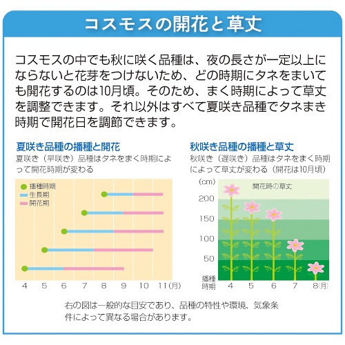 - 花期、収穫期(○○どり)、高さ、収穫重量などの性質は、一般平坦地における適期栽培でのおおよその目安です。