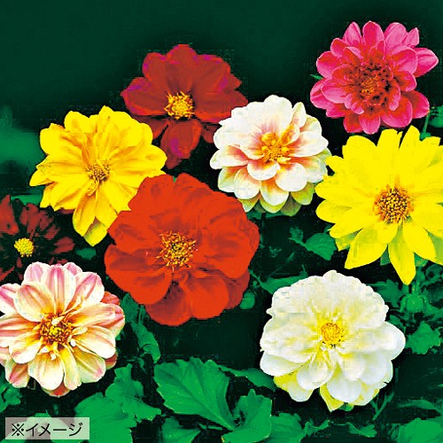八重咲きの種子系ダリア。透明感ある多彩な花色の混合が楽しめる。
