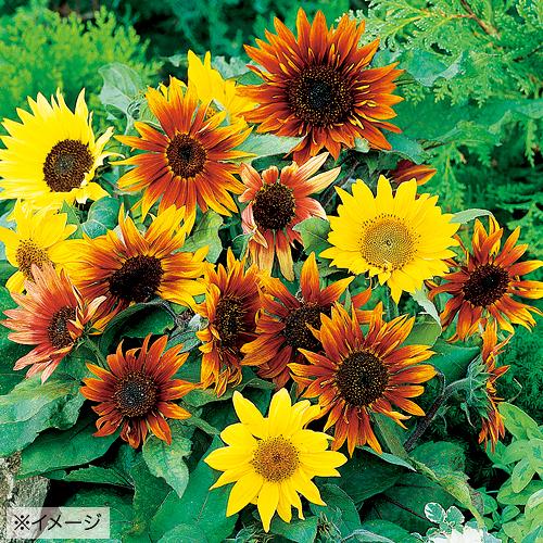 中矮性で黄色や、レモン色、赤、複色など多彩な混合種。タネまき後約60日で開花。