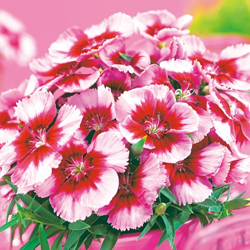 四季咲きダイアンサスの中でも花径3.5~4cmと大きく目立ち、可愛らしいパステルピンク地の花を咲かせる。ナデシコ科