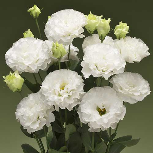 美しい純白の大輪八重咲き中生種。花弁数は多く、軽快なフリルが入り立体的でボリュームのある花型。大輪で一輪一輪が豪華でとても美しい。長い草丈を生かした切り花やブーケ、アレンジを幅広く利用できる。