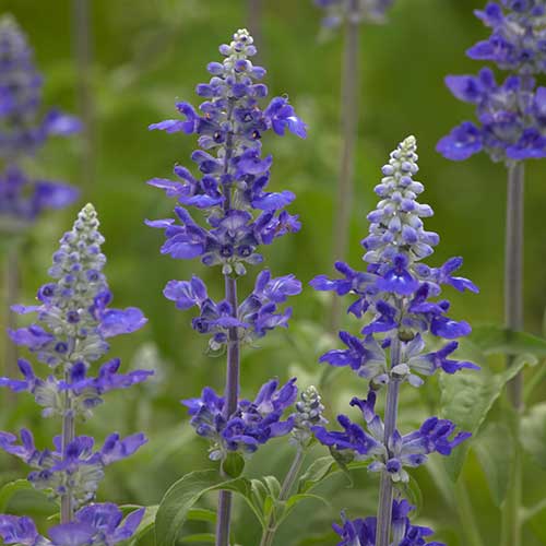 灰白色を帯びた花茎と花色の対照が美しく、清楚な花姿が人気。花は普通のサルビアに比べてずっと小さく、密に群がりついて花穂は長くなる。