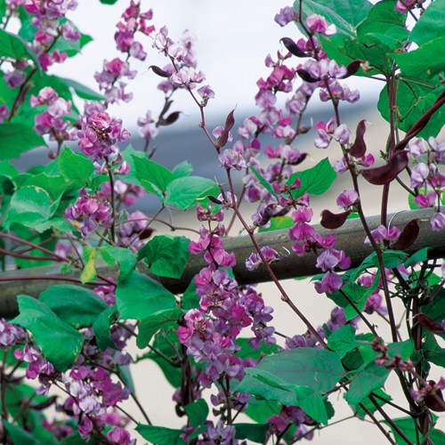 真夏の光を遮る濃い葉色のツル性植物。秋に咲くスイートピーのようなピンク色の愛らしい花と、赤紫の大きなサヤも美しい。少ない肥料でもよく育ち、赤いツルをよく伸ばし、暑さ、乾燥にも比較的強い。マメ科
