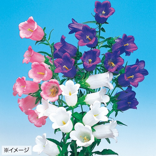 人気の鉢花向きカンパニュラ。9月に播種で翌年開花する早生種。茎はかたく、1株に5茎以上立つ。キキョウ科