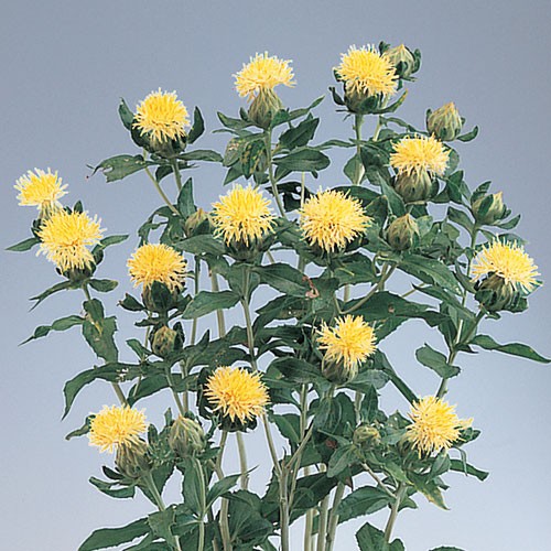 丸葉で黄花種。染料の作物としても有名な紅花の改良種。花径約3cmの作りやすい切り花向き草花。茎がしっかりしていて、ドライフラワーにも好適。キク科