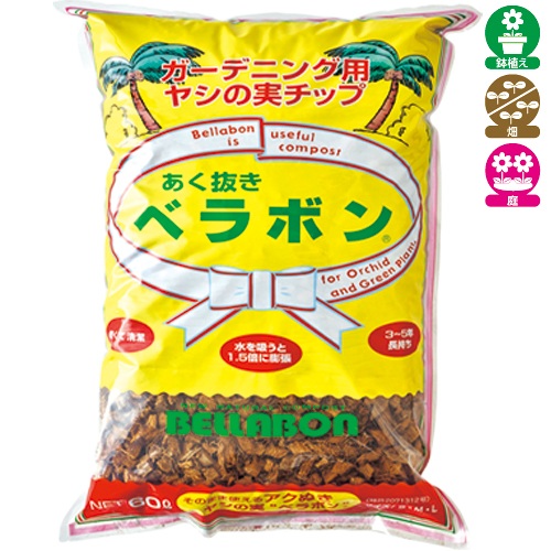 ベラボンのチップは特殊なカット製法で吸水、排水性がよく、土壌のすき込み、マルチングに使用すると水たまりを防ぎ、通気性の向上により根張りがよくなります。マルチングで使用すると雑草抑制効果もあり、植え替え時に土壌にすき込めば一石二鳥。5年くらい長持ちします。あく抜き済みなので鉢植えプランターにも使用できます。(タイ製)