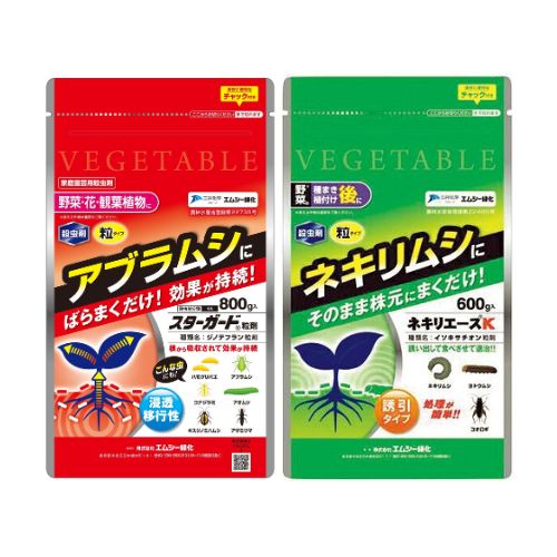 農薬選びに迷ったらコレ!主要な害虫を退治できる殺虫剤をセットにしました。葉を食害・吸汁するアオムシ・アブラムシにスターガード粒剤、土の中で根を食べるネキリムシにネキリエースKで退治します。どちらも株元にばらまくだけ(※生育期に使用時)、と手軽に使えます。同時施用も可能です。(日本製)