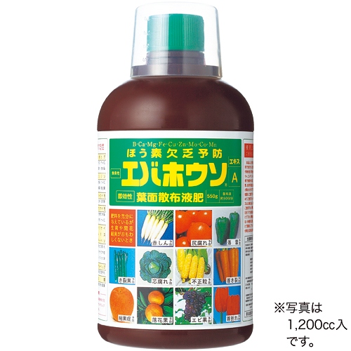 ホウ素欠乏による新葉の奇形、芯止まり、芯枯れ、葉柄のコルク化、果実・果肉のコルク化や裂果などの予防に適した速効性の葉面散布剤です。(日本製)