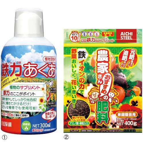 鉄は光合成の促進やエネルギー生産に不可欠な栄養素で、植物本来の生命力や能力を引き出します。「鉄力あくあ®」は植物に吸収しやすい二価鉄イオンを含みます。「NEW鉄力あぐり®スーパー」は鉄に加えて肥料成分、アミノ酸や骨粉を配合しています。(日本製)