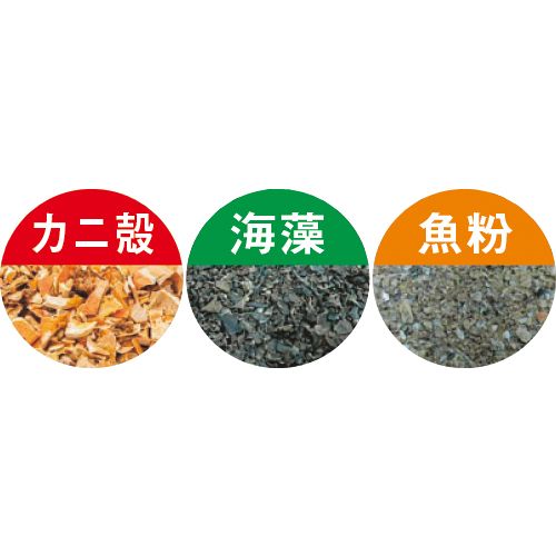 カニ殻(40%)、海藻(12%)、魚粕(12%)、植物粕(36%)ペレット状で散布が簡単。海のめぐみ由来の豊富なアミノ酸類やミネラルを含んだ肥料で、カニ殻由来のキチン質は有用菌の増殖を活性化しフザリウム菌を抑制し連作障害の軽減に役立ちます。アスタキサンチンは植物の色つやを向上。海藻に含まれる成分(多糖類)は、食味向上や健全な作物づくりに役立ちます。(日本製)