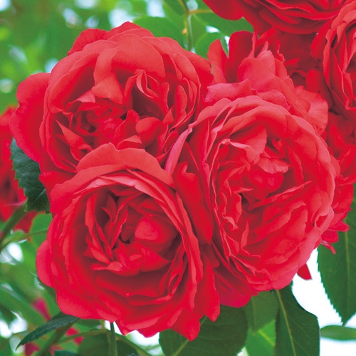 濃赤色の丸弁カップ咲き。一枝に数輪つけ、枝をまっすぐ伸ばしても株元からよく咲く。耐病性がとても強く丈夫で育てやすい。シュート更新タイプではなく古枝も咲き続く。返り咲き。コルデス作出。バラ科