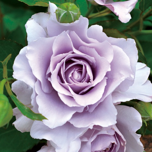ひらひらと波打つ花弁で、上品な藤色が中心に向かい濃くなる魅力的な花容。さわやかな香り。耐病性に優れる。バラ科