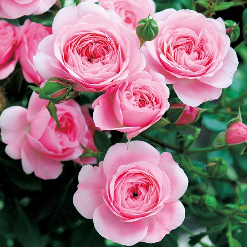 ローズピンクのカップ~ロゼット咲き。房咲きで花もちがとてもよい。枝を短めにしたブッシュ仕立てや、伸ばしてフェンス仕立てにも楽しめる。バラ科