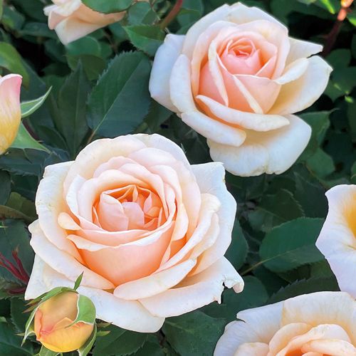 アプリコット基調で中央が濃く、咲き進んで外側から白みを帯びていく花色。コロンとした抱え咲き中大輪。甘くさわやかな澄んだティーローズ香を連想させる芳香。春は3~5輪の房咲きで、細枝にも花を咲かせる。清らかな心を色と香りで表現した優しいバラ。バラ科