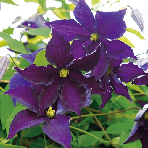 青紫の花弁と黄色い花芯のコントラストが美しい中輪花。生育がよく夏に向けて枝がよく伸び、たくさんの花をつける。育てやすく初心者にも向く。キンポウゲ科