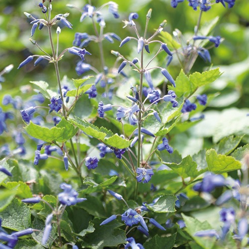 木立性。明青色花を葉の間から伸びる枝の節々に咲かせる。まとまりのよい草姿で葉物としても重宝し、他の宿根草との混植にもおすすめ。キンポウゲ科