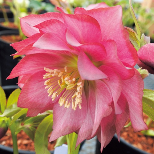 ピンクの花弁にアンティーク調の覆輪が入り、その二色の色が重なって個性的な色合いが生まれる。花弁の濃淡や覆輪の入り方には個体差があるのも魅力。秋~翌春は日向で、夏は半日陰で管理する。キンポウゲ科