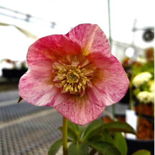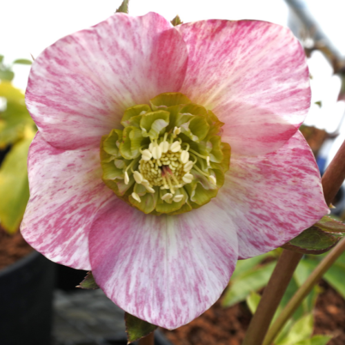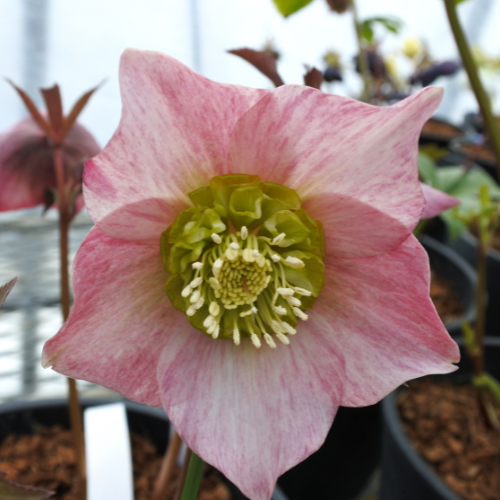 白の花びらにピンク色の絞り模様が入ったセミダブルの花。 和のテイストを感じられるとても特徴的なクリスマスローズ。秋~翌春は日向で、夏は半日陰で管理する。キンポウゲ科