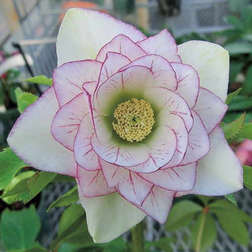純白の花弁に鮮明な糸ピコティーが入り、さらに花弁の内側にきれいなベインの入る繊細な美花。横下向きに咲く。キンポウゲ科