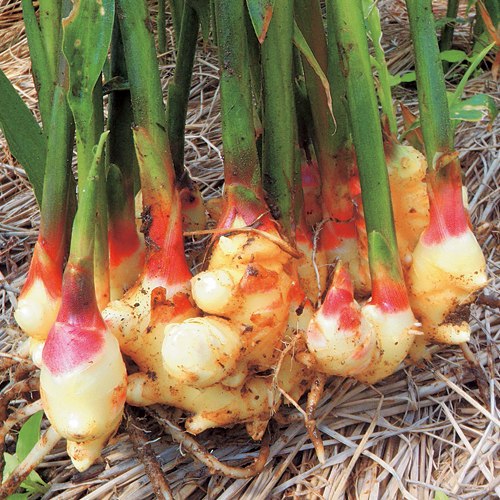 大ショウガは1片が150~200g、小ショウガは40~50gに手で切り分けた塊茎を2~3日乾燥させる。畝幅約70cm、株間約20cm、深さ5~6cmに、芽を斜め上にして植え付ける。新芽が伸びてきたころ、追肥・土寄せをし、乾燥に弱いので敷きわらを敷く。茎葉が黄変する10~11月に収穫。
