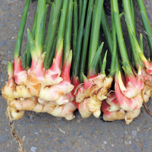 小ショウガは40~50gに手で切り分けた塊茎を2~3日乾燥させる。畝幅約70cm、株間約20cm、深さ5~6cmに、芽を斜め上にして植え付ける。新芽が伸びてきたころ、追肥・土寄せをし、乾燥に弱いので敷きわらを敷く。茎葉が黄変する10~11月に収穫。