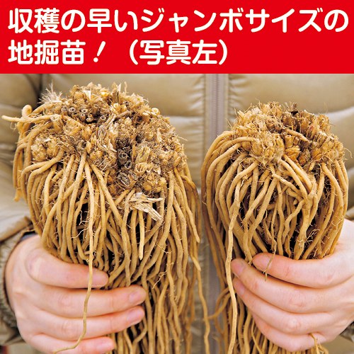 すぐに収穫できるサイズの地掘苗(肩の幅が約8cm)でお届けするので、簡単な管理でさらに大株となり、毎年収穫できる。本種は食味が濃厚で、甘みも豊かな優良種。