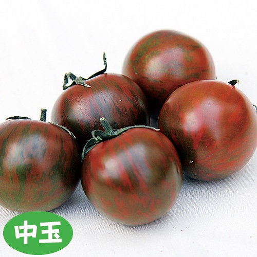 ゼブラ柄の珍しい果皮が特徴的な、やや小ぶりの中玉種。甘みに加え、うまみ成分のグルタミン酸やアスパラギン酸を多く含むため、噛めば噛むほどうまみを強く感じる。果肉はややかためで、噛み応えのある独特の食感を楽しめる。成熟は大玉トマト並みの晩生種。