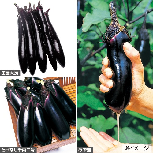 果長は35~40cm程度にもなる大長ナス。果色はツヤのある黒紫色で、果肉が特にやわらかで品質は極上。焼きナスにすると絶品。大長ナスとしては早生で、草勢、耐暑性が強く、大変作りやすい人気品種。