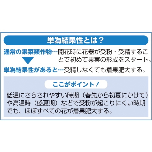 高い単為結果性で安定して着果肥大する特長をもつ。ボリュームのある太長果形で果揃いがよく、やわらかな肉質で食味よい品種。トゲなしタイプで扱いやすい。