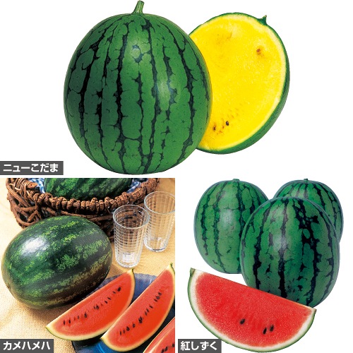 幅広い縞をもつ枕形のユニークな外観。肉質はかためで、歯ざわりのよい食感が楽しめる。糖度は12~13度と高く安定する。日もちがよく、裂果の心配も少なく、着果が安定し作りやすい。