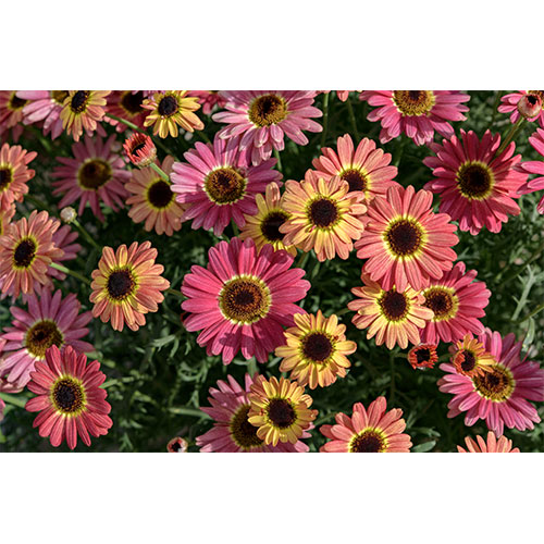 開花~終盤までそれぞれの花色が赤やオレンジ、黄色など変化し続け、1株でさまざまな色のコントラストが楽しめる。キク科