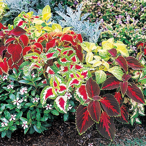 豊富な葉色で花にも劣らない華やかさ。花壇や寄せ植えに好適。シソ科