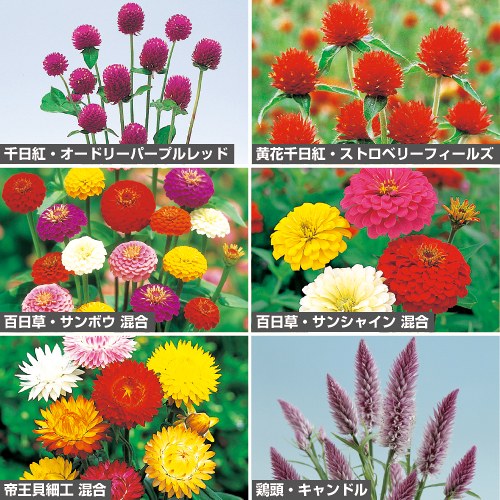 ※百日草と帝王貝細工の写真はイメージです。混合種を播種するため、花色に偏りが出ることがあります。あらかじめご了承ください。
