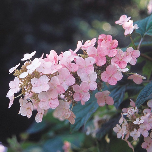 白い花穂は次第に桃色に変化する。条件が合えば紅葉も見事。育てやすく、ある程度成長するまでは無剪定で栽培できる。アジサイ科