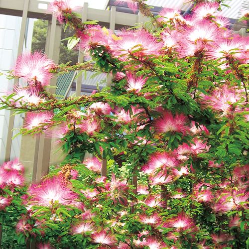 幻想的な美しいピンク色花を木全体に咲かせる姿は見応えがある。矮性の常緑樹だが寒さに当たると落葉する。マメ科