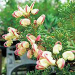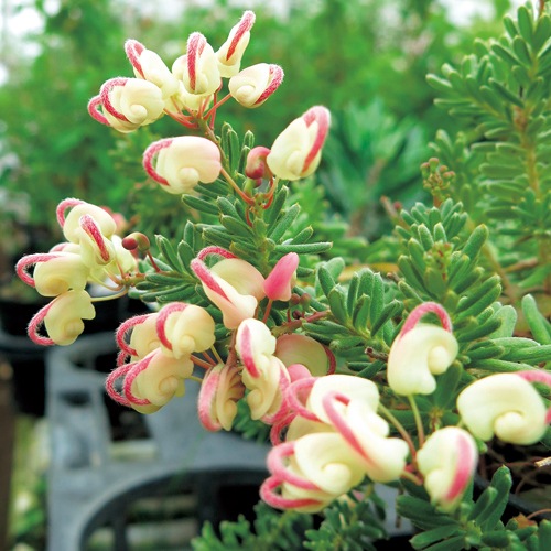 わずかに自立する這性で成長するとドーム状になる。赤い花柱と白花の組み合わせが目を引く。ヤマモガシ科