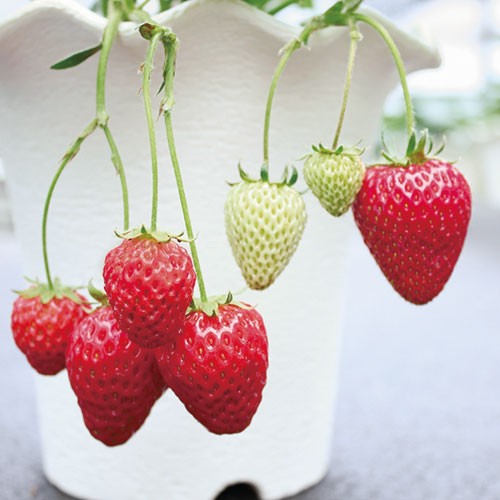 1果20~30g。糖酸のバランスがよい絶妙な甘さで、大変優れた食味。比較的うどんこ病に強く育てやすく、初心者にも向く。春、秋とも収穫できる四季なり品種。バラ科