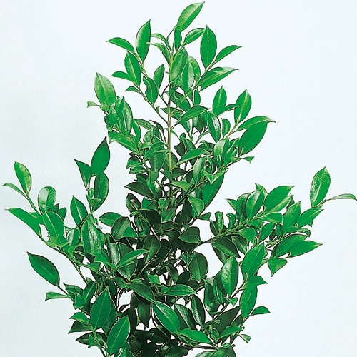 光沢ある美葉。花はクリーム白色で、秋には黒い実がなる。日陰でもよく育つ。モッコク科