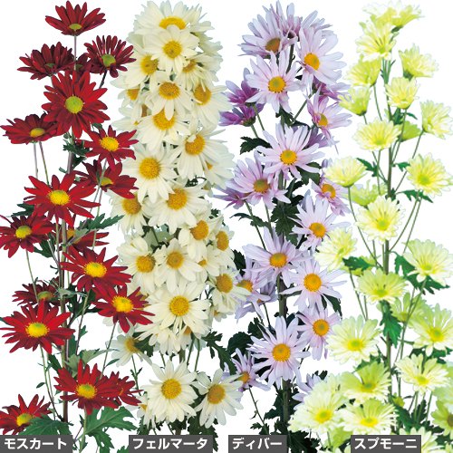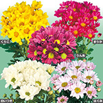 花径4~4.5cm。花が下から咲き進む、一定の範囲が一斉に咲くなど、新しい咲き方のスプレーマム。キク科