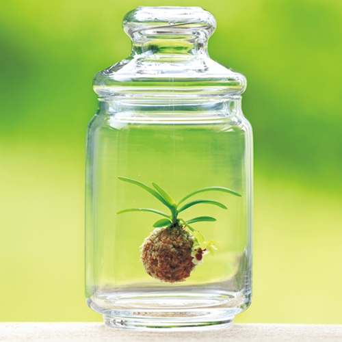 ガラス容器の中で観葉植物としてランを栽培し楽しむ、新しいスタイルのテラリウム。水ゴケを巻き付けたランを、ふたからテグスでつるしており、瓶のふたを開けない限り中の湿度で水やりの必要がない。風通しも関係ないので管理の手間は、ほぼ不要。