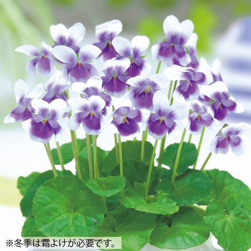常緑の四季咲きビオラで、径2.5cmほどの白と紫の複色花が愛らしい。ランナーを伸ばしながら横に広がっていくので、グラウンドカバーはもちろん、ハンギング仕立てにもおすすめ。スミレ科