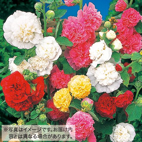 「タチアオイ」とも呼ばれる、育てやすい宿根草。華やかな八重咲き種をセットに。アオイ科