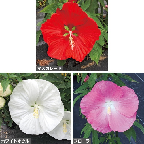 タイタンビカスの新シリーズ。ホワイトオウルは株がまとまるミニタイプ。フローラは花の中心部が白くなるショートタイプ。マスカレードはフリル状に咲くショートタイプ。鉢植えや寄せ植えにもおすすめ。アオイ科
