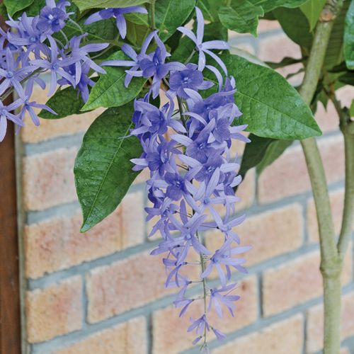 淡紫色のがくに濃紫色の花弁。茎の先端に総状花が枝垂れ、花後も美しいがくが残り長く観賞できる。本種は従来のペトレアと比べ、がく、花、葉が大きく、さらに見応えがある。冬季は室内で管理する。クマツヅラ科