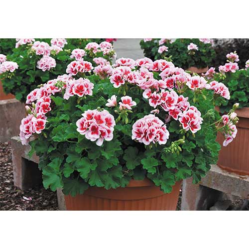 強健ハイブリッドゼラニウム。一般品種と比べ低温期でも生育がよい。真夏でも生育しながら花が咲き続け、秋にはさらに株が充実し、たくさんの花を楽しめる。大きな花房。白花弁に大きく赤色斑点模様が入る。フウロソウ科