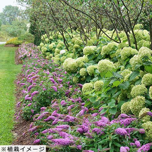 従来の矮性ブッドレアよりふっくらボリュームのある大きな花穂。白色花。小さな庭や鉢植えで楽しみやすいコンパクトでまとまりやすい樹形。初夏から霜が降りる頃まで繰り返し咲き、長く花を楽しめる。フジウツギ科