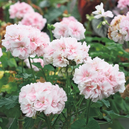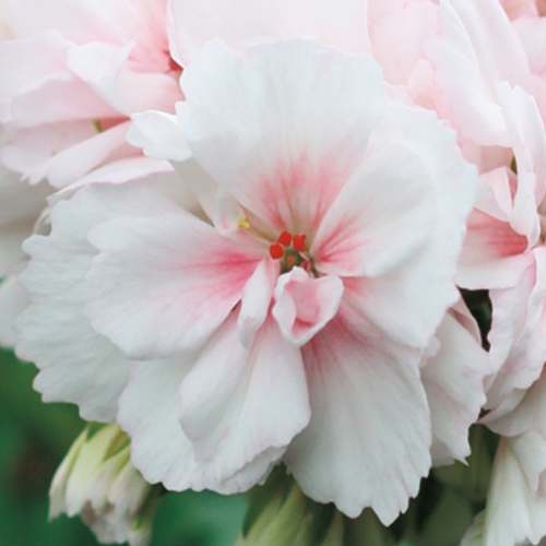 八重咲き多花品種「源氏車」の選抜品種。花弁にフリルが入るのが特徴で、より一層華やかな印象になる。フウロソウ科