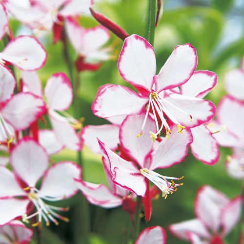 細長い茎の先に愛らしい蝶のような小花を長期間咲かせる花姿が魅力。風に揺れる様子がとても優雅でナチュラルな雰囲気を演出します。丈夫で育てやすく、比較的手間いらずで初心者にもおおすすめ。アカバナ科