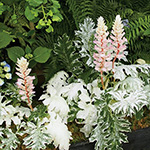 別名「ハアザミ」。地中海沿岸部原産の多年草で、深く切れ込みの入った濃緑色葉が特徴。本種はクリーム色の斑が入った一際目を引く葉を楽しめる。花はピンクとクリーム2色の優しい色合いが魅力。キツネノマゴ科